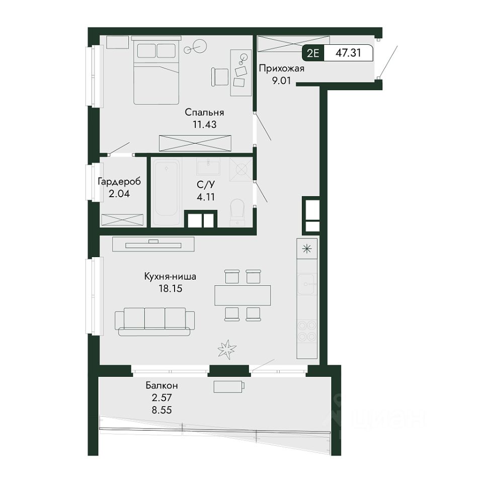 Продаётся 2-комнатная квартира в строящемся доме (дом 2), срок сдачи: III-кв. 2027, общей площадью 47.31 кв.м., на 6 этаже.