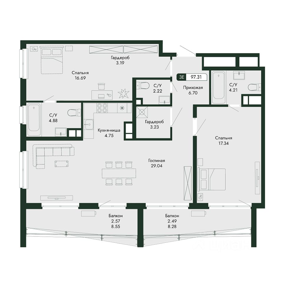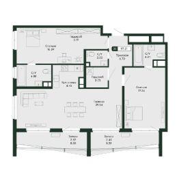 Продаётся 4-комнатная квартира в строящемся доме (дом 2), срок сдачи: III-кв. 2027, общей площадью 97.31 кв.м., на 7 этаже.