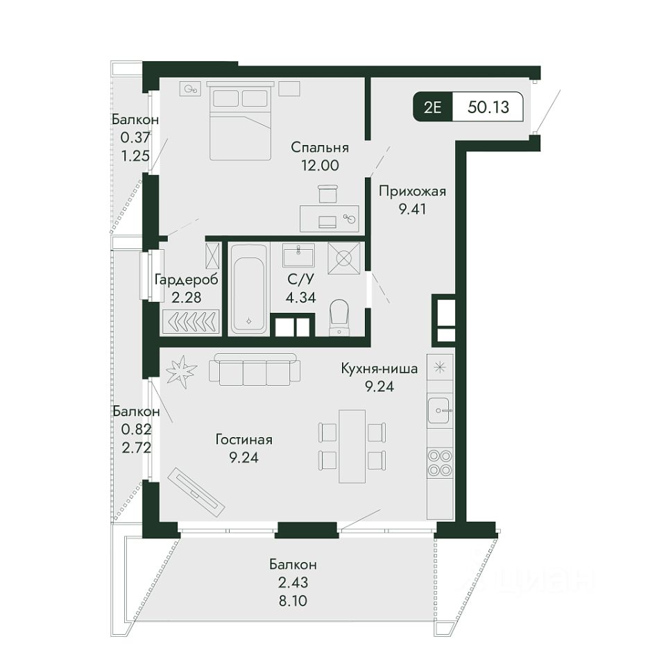 Продаётся 2-комнатная квартира в строящемся доме (дом 2), срок сдачи: III-кв. 2027, общей площадью 50.13 кв.м., на 4 этаже.