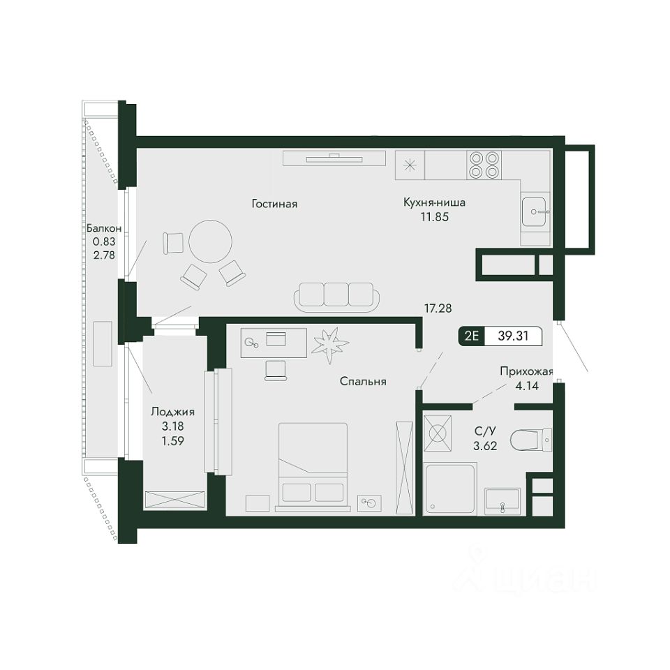Продаётся 2-комнатная квартира в строящемся доме (дом 2), срок сдачи: III-кв. 2027, общей площадью 39.31 кв.м., на 5 этаже.