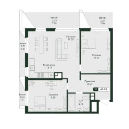 Продаётся 3-комнатная квартира в строящемся доме (дом 2), срок сдачи: III-кв. 2027, общей площадью 68.93 кв.м., на 5 этаже.