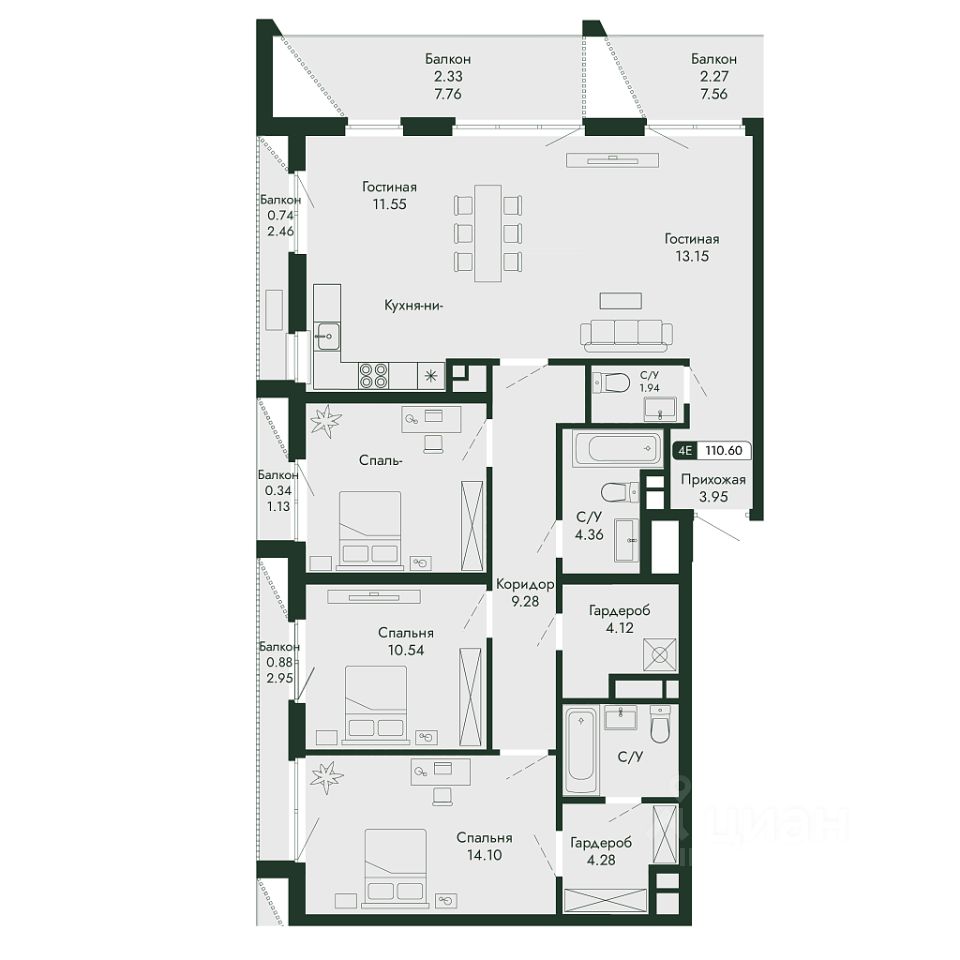 Продаётся 5-комнатная квартира в строящемся доме (дом 2), срок сдачи: III-кв. 2027, общей площадью 110.6 кв.м., на 7 этаже.