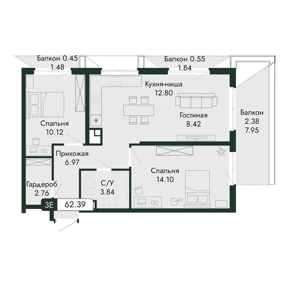 Продаётся 3-комнатная квартира в строящемся доме (дом 2), срок сдачи: III-кв. 2027, общей площадью 62.39 кв.м., на 4 этаже.