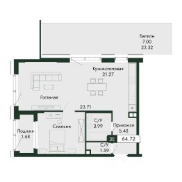 Продаётся 3-комнатная квартира в строящемся доме (дом 2), срок сдачи: III-кв. 2027, общей площадью 64.72 кв.м., на 1 этаже.