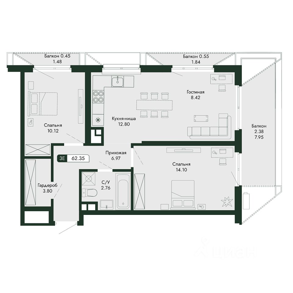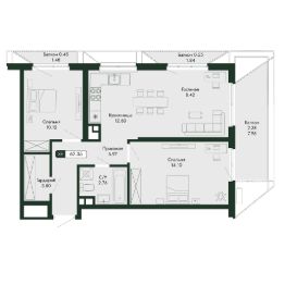 Продаётся 3-комнатная квартира в строящемся доме (дом 2), срок сдачи: III-кв. 2027, общей площадью 62.35 кв.м., на 6 этаже.