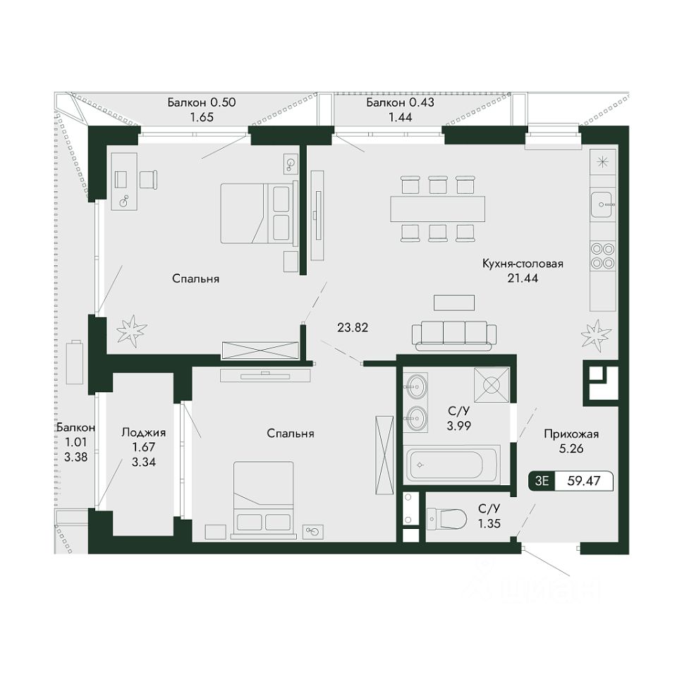 Продаётся 3-комнатная квартира в строящемся доме (дом 2), срок сдачи: III-кв. 2027, общей площадью 59.47 кв.м., на 5 этаже.