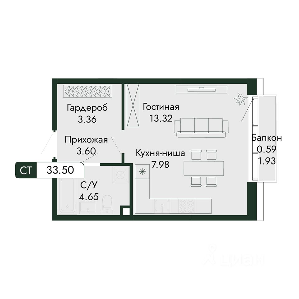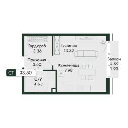 Продаётся студия в строящемся доме (дом 2), срок сдачи: III-кв. 2027, общей площадью 33.5 кв.м., на 1 этаже.