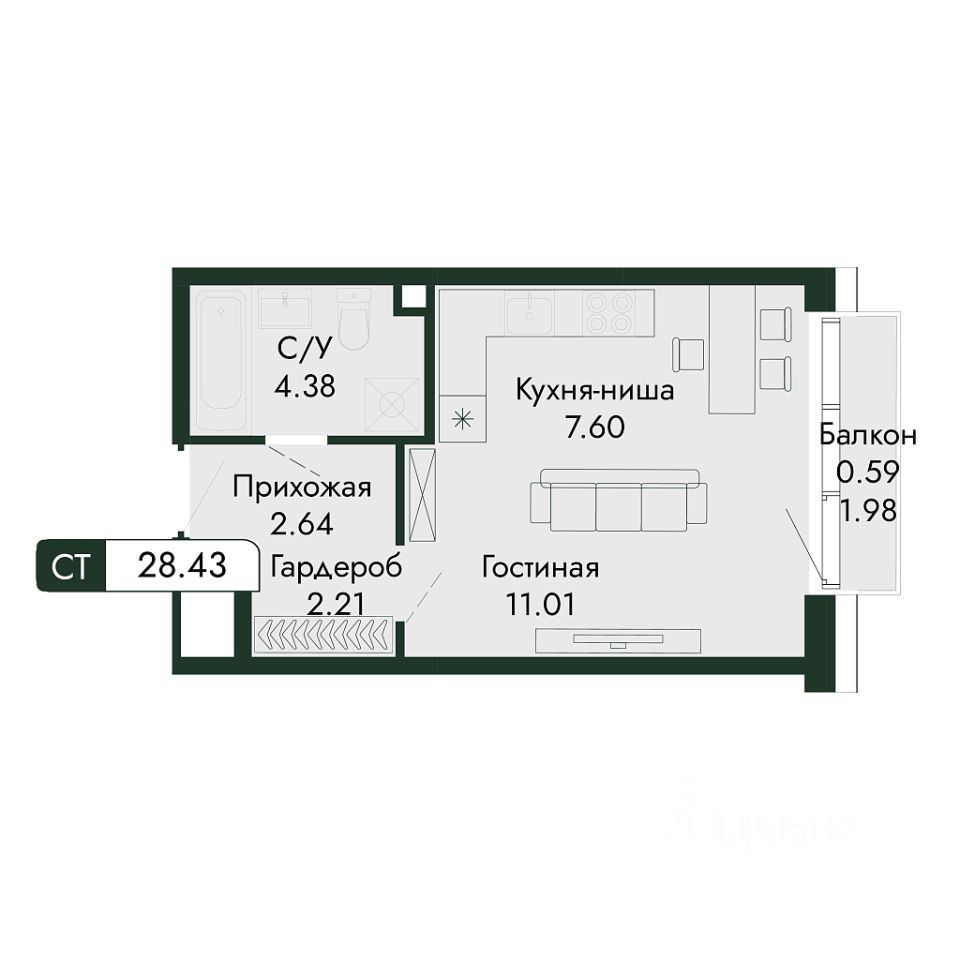 Продаётся студия в строящемся доме (дом 2), срок сдачи: III-кв. 2027, общей площадью 28.43 кв.м., на 1 этаже.