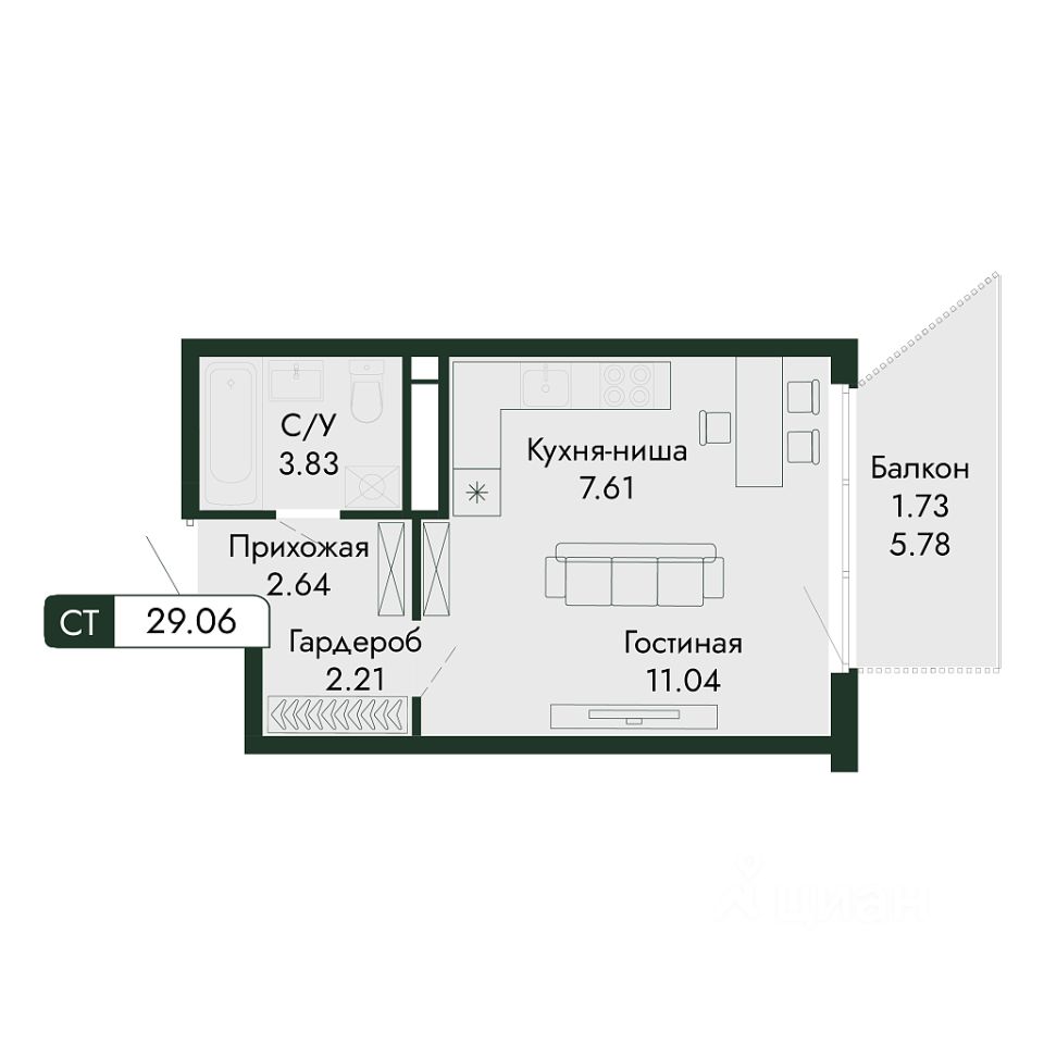 Продаётся студия в строящемся доме (дом 2), срок сдачи: III-кв. 2027, общей площадью 29.06 кв.м., на 4 этаже.