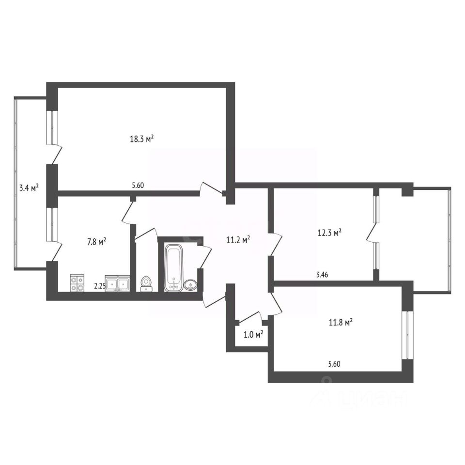 Общая площадь квартиры составляет 65,7 квадратных метров. В дополнение к этому, имеется большой балкон, объединяющий две комнаты, и лоджия с теплыми полами, которые является прекрасным местом для отдыха и откуда открывается привлекательный вид на залив и степь.