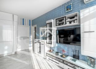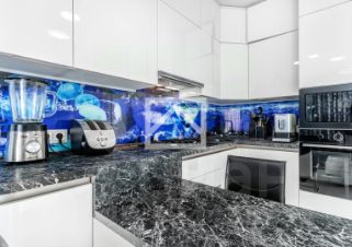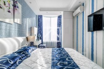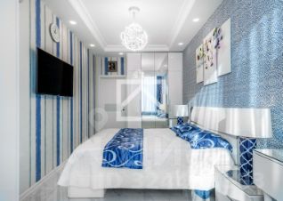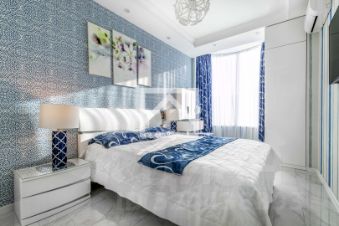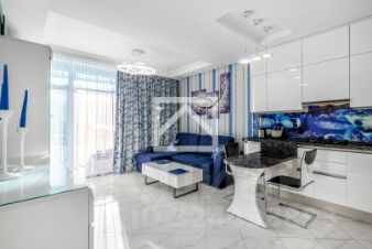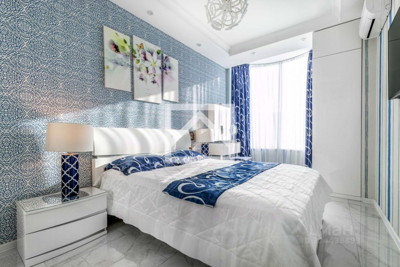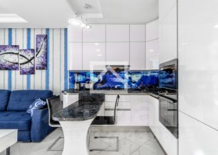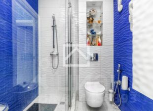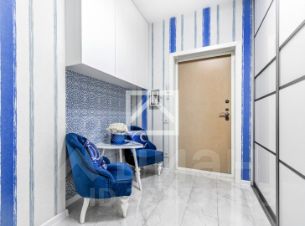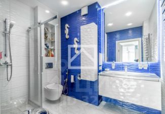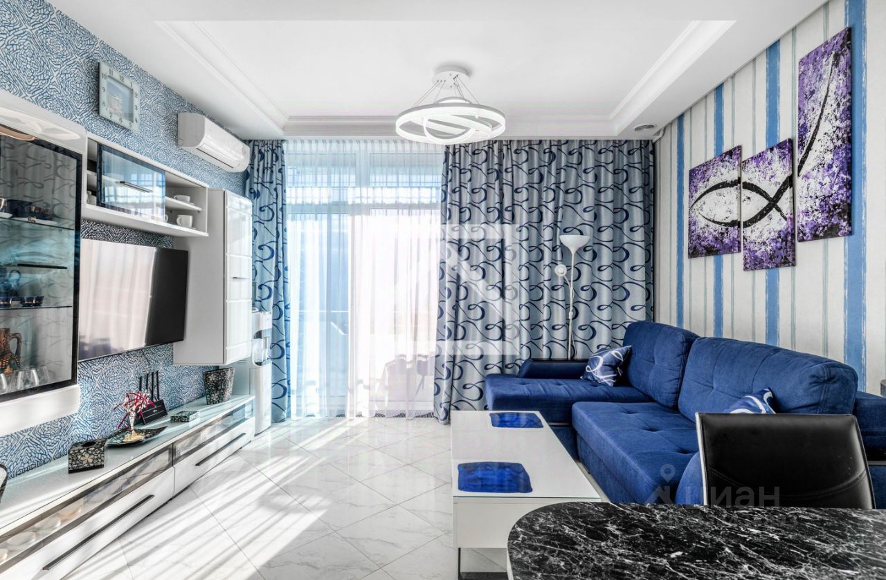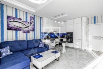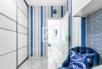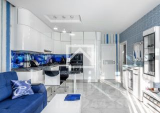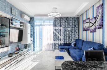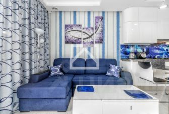 В квартире выполнен современный дизайнерский ремонт в палитре сине-белых оттенков, придающей пространству динамику и визуальную глубину. Пространство укомплектовано стильной мягкой мебелью насыщенного синего цвета, надежной бытовой техникой и продуманными деталями интерьера, формируя комфортную зону отдыха.