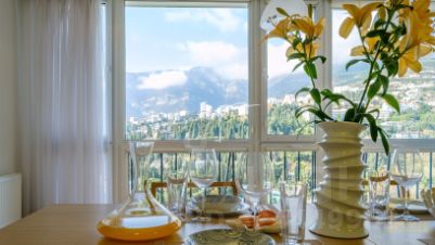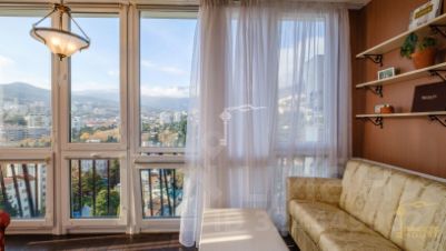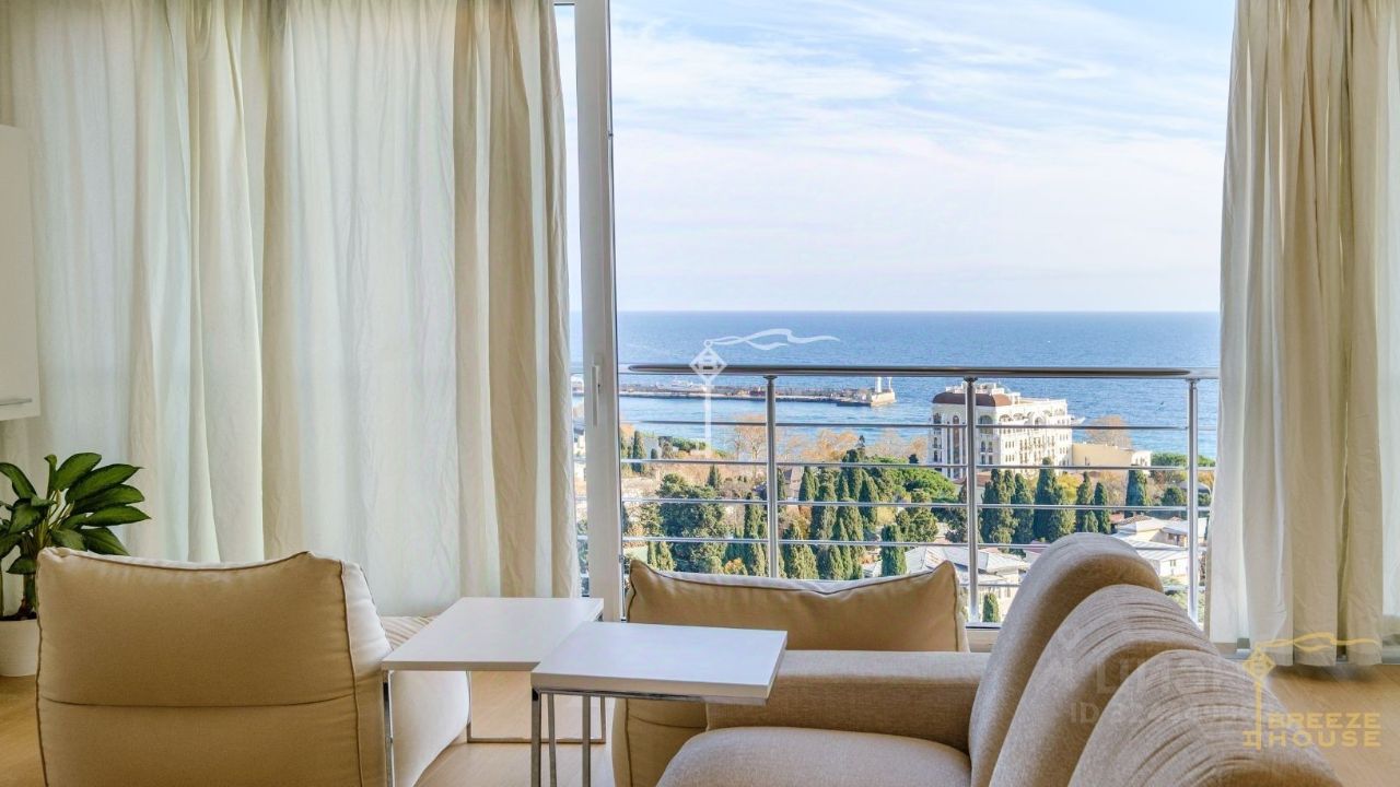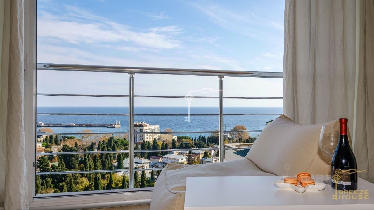 Панорамное остекление открывает завораживающие виды сразу на два направления: бескрайнее Черное море с Ялтинским маяком и величественный горный массив.
