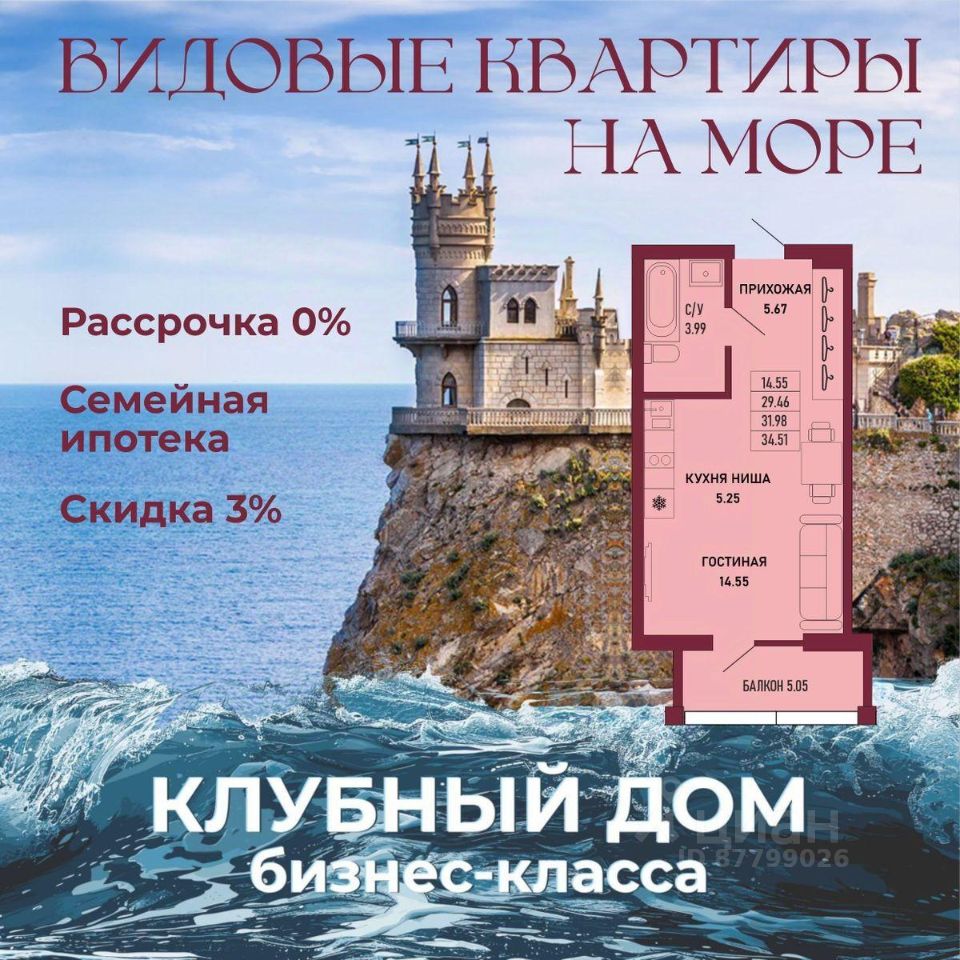 ЗВОНИТЕ ПРЯМО СЕЙЧАС, ЧТОБЫ ЗАБРОНИРОВАТЬ ЛУЧШУЮ КВАРТИРУ! Цена указана со скидкой 5% при условии 100% оплаты либо ипотека. - 80% ВИДОВЫХ КВАРТИРА НА МОРЕ ИЛИ ГОРЫ - Рассрочка 0% - Ипотека от СБЕРБАНКА - Доходность инвестиций от 40% годовых. - Безопасная сделка по ФЗ-214/эскроу-счёта Клубный дом "Ялта" — это воплощение изысканной жизни, где гармонично сочетаются статусность бизнес-класса, уют курортного отдыха и передовые технологии для комфортного проживания. Этот жилой комплекс создан для тех, кто ценит безупречное качество, безопасность и эстетику в каждой детали. Архитектура и дизайн * Современное монолитное 16-этажное здание * Фасады благородных оттенков: чистый белый, переливы шампань и тёплое золото * Первые этажи комплекса представлены в отделке рустовым камнем * Авторские интерьеры мест общего пользования * В темное время суток здания подчёркивает подсветка Характеристики квартиры и мест общего пользования * 80% лотов — с панорамными видами на море и горы. * Просторные балконы * Вместительные гардеробные и кухни-гостиные * Высокие потолки квартир 2,8 м Инфраструктура для комфортной жизни * Инфинити-бассейн * Ландшафтный дизайн и озеленение придомовой территории комплекса * Скоростные грузопассажирские лифты, соответствующие стандартам 5*-отелей, с прямым доступом в паркинг. * Кафетерий и магазин у дома * Детский веревочный комплекс "Парк-Маугли" * Скалодром * Финская сауна, хамам * На 1 этаже жилого комплекса - лапомойка и гостевой туалет Безопасность и технологии спокойствия * Закрытая территория, контролируемый доступ * Видеонаблюдение по всему периметру комплекса * Электронные домофоны с индивидуальными ключами с доступом * Безбарьерная среда * Подземный паркинг * Келлеры * Зоны хранения для велосипедов, самокатов и колясок * Мотоместа Коммуникации и инженерия * Автономная газовая котельная на крыше * Телеметрия * Класс энергоэффективности жилого комплекса "А+" * Места для кондиционеров и практическое решение для маскировки коммуникаций Расположение и ближайшие пляжи * 2,9 км до моря 10 мин на машине * 2 км от центра Ялты * Пляж Приморский — 30 мин пешком / 10 мин на авто * Пляж Массандровский — 20 мин на машине