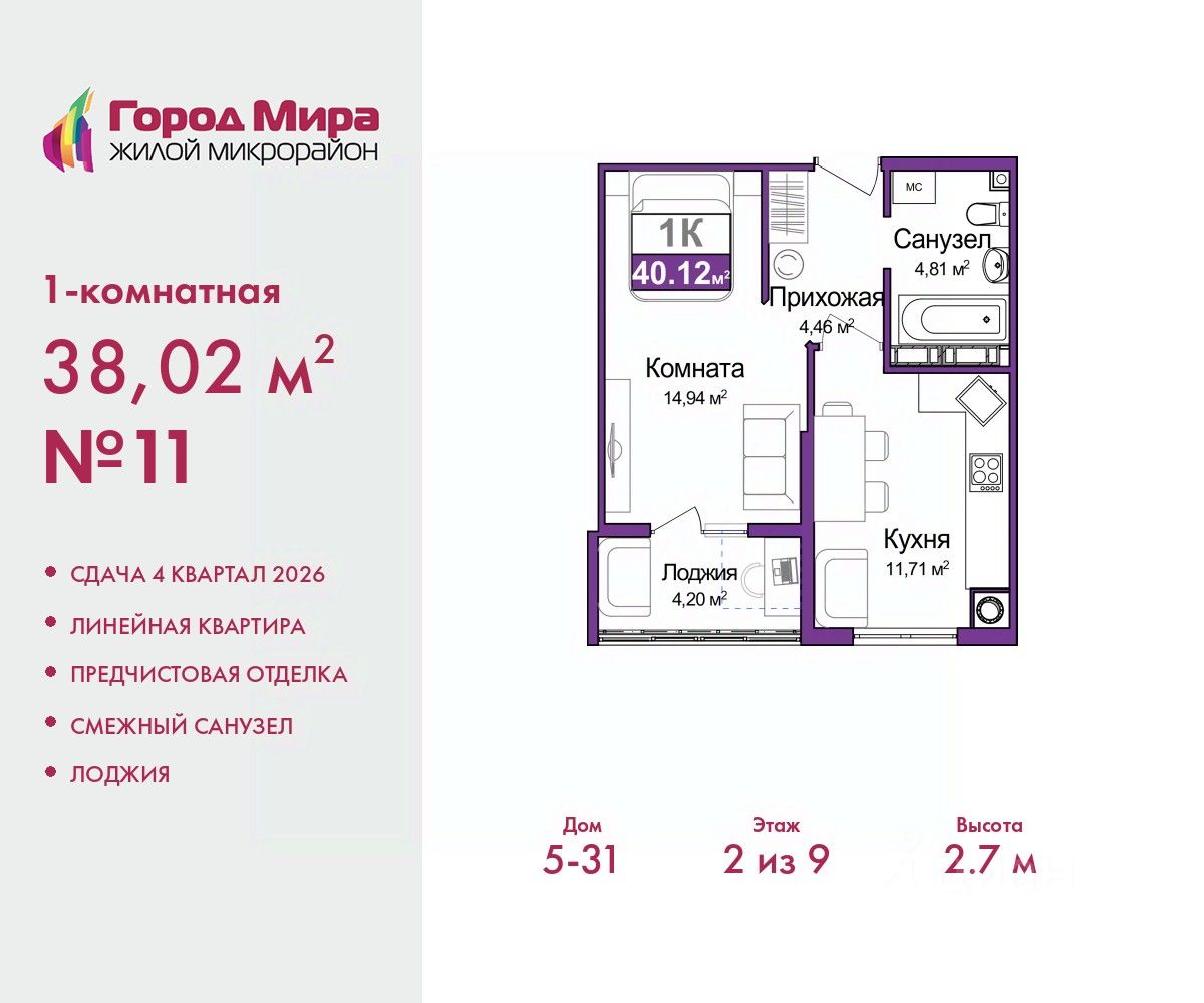 Просторная 1-комн. квартира с предчистовой отделкой в ЖМ "Город Мира" на 2 этаже. Общая площадь: 38.02 кв.м., жилая: 14.94 кв.м., площадь просторной кухни-столовой: 11.71 кв.м. Все окна выходят на одну сторону. В квартире одна лоджия, один совмещенный санузел. Высота потолков 2.7 м.