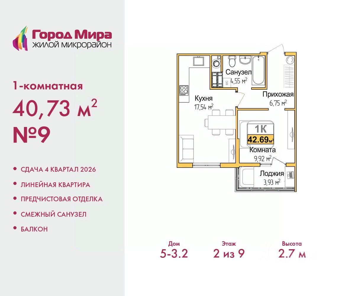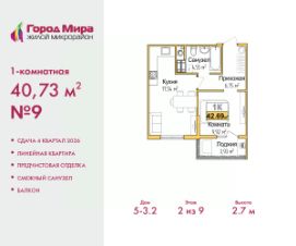 Продается однокомнатная квартира с предчистовой отделкой в ЖМ "Город Мира" на 2 этаже. Общая площадь: 40.73 кв.м., жилая: 9.92 кв.м., площадь просторной кухни-столовой: 17.54 кв.м. Все окна выходят на одну сторону. В квартире один балкон, один совмещенный санузел. Высота потолков 2.7 м.