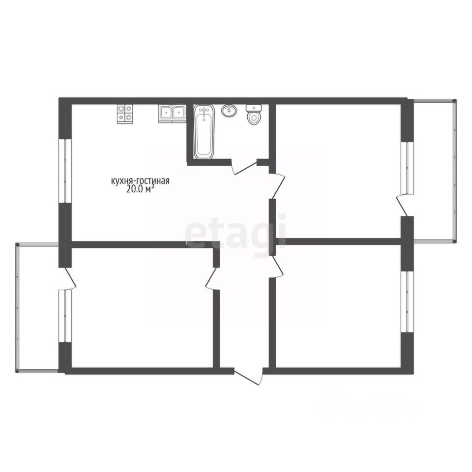 Состоит из кухни-гостинной и 3-х спален, а так же 2-х балконов (10 кв.м.)