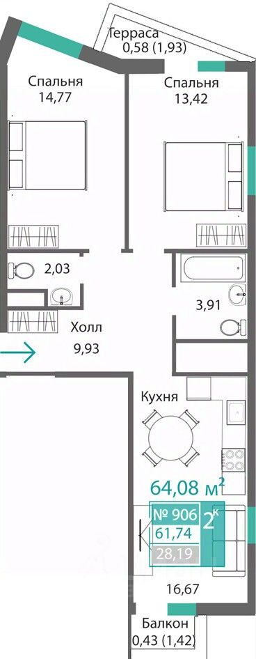 Общая площадь61,74 м²