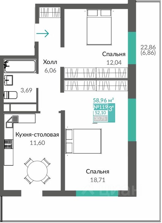 - Большой холл площадью 5,4 кв. м создаст приятное первое впечатление и позволит удобно разместить шкаф для верхней одежды.