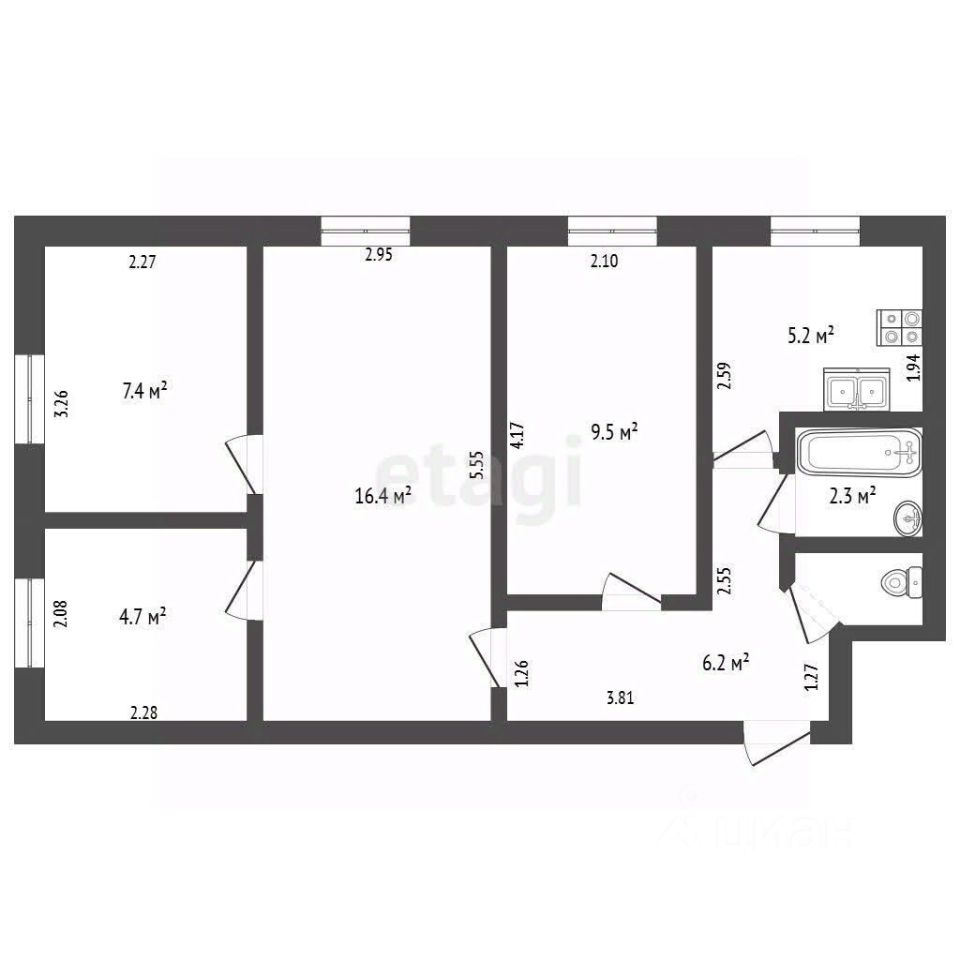 Общая площадь: 52.4 м.кв, жилая: 38м.кв.
