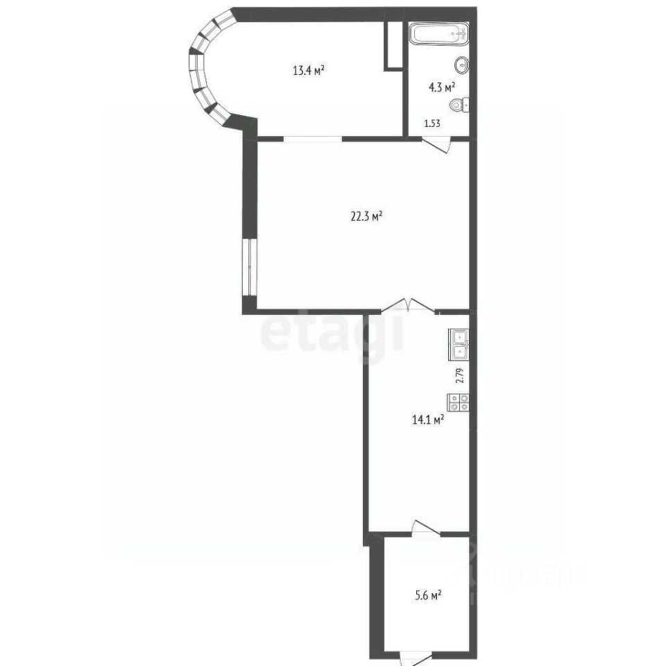 Апартамент состоит из просторной входной группы, которую можно оборудовать под зону отдыха, кухни гостиной, совмещенного санузла и спальни.