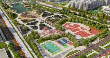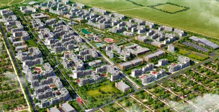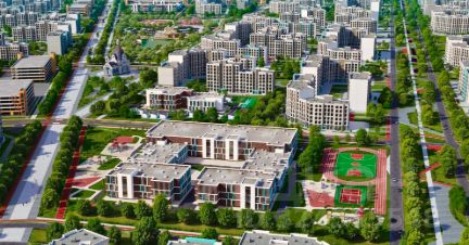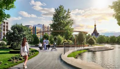 Целый городской квартал с паркингами, торговыми галереями, аквапарком, детскими и спортивными площадками мирового уровня, ландшафтными парками, аллеями и даже Храмом.