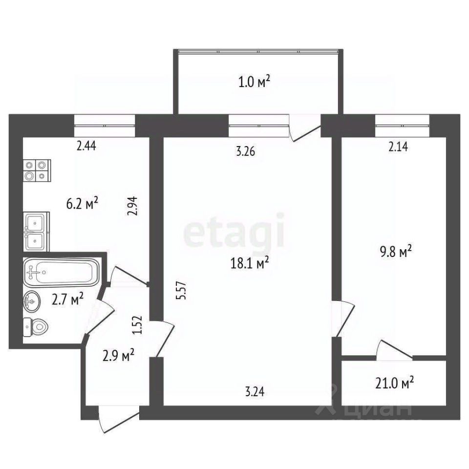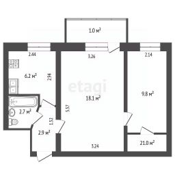 Общая площадь квартиры составляет 43,7 кв. метров, жилая - 28 кв. метров. В квартире имеются 2 раздельные комнаты площадью 18.1 и 9.8 кв. м. Кухня - 6,2 кв. м. Санузел совмещенный.