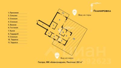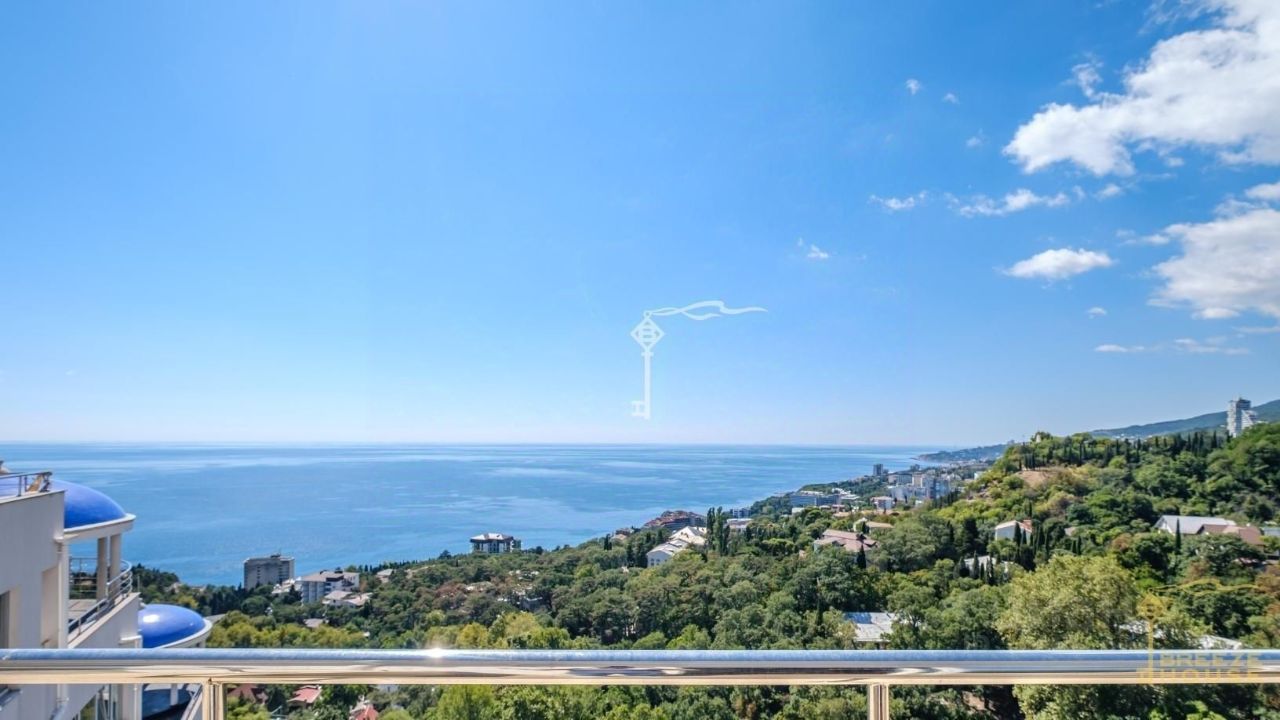 Пентхаус расположен на верхнем девятом этаже здания и имеет террасы с видом на лазурное море и гору Ай-Петри.