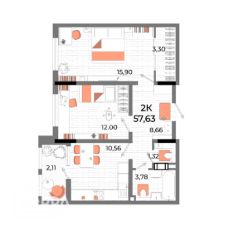 - 2 комнаты общей площадью 57,63 кв.м , жилой - 28 м², где вы сможете создать уютное пространство для себя и своей семьи.