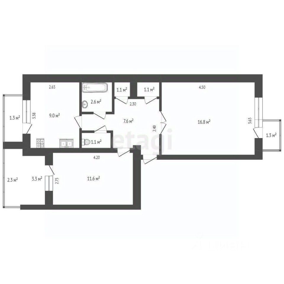 Квартира светлая, с окнами на две стороны, открывающими одновременно морскую панораму и вид во двор. Планировка включает в себя две изолированные комнаты, 2 балкона (из комнаты и кухни), большая лоджия (из комнаты), кухню, кладовку, гардеробную и раздельный санузел. Инженерные коммуникации — установлено автономное газовое отопление (двухконтурный газовый котел) — обеспечивают надежность и экономичность в эксплуатации.