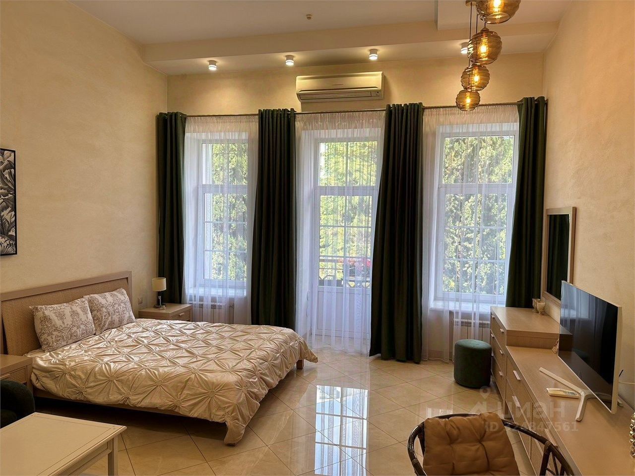 -Стиль интерьера: Современная классика или неоклассика. Дизайн выполнен в светлой цветовой гамме с благороднымии оливковыми акцентами в декоре, что создает атмосферу уюта и респектабельности.
