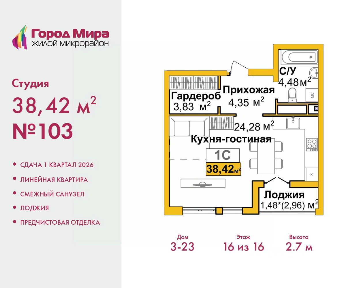 1-комн. квартира-студия с предчистовой отделкой в ЖМ "Город Мира" на 16 этаже. Общая площадь: 38.42 кв.м., площадь гостиной 24.28 кв.м., из которых 5 кв.м. выделено под кухонную зону. Все окна выходят на одну сторону. В квартире одна лоджия, один совмещенный санузел. Высота потолков 2.7 м.