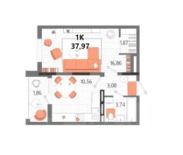 Планировка: Комната (17кв.) с гардеробной (2 кв.м); Прихожая с местом под встроенный шкаф (3,08); Лоджия (1,86); Кухня-гостиная (10,6); Совмещенный С/У (3,8кв.)