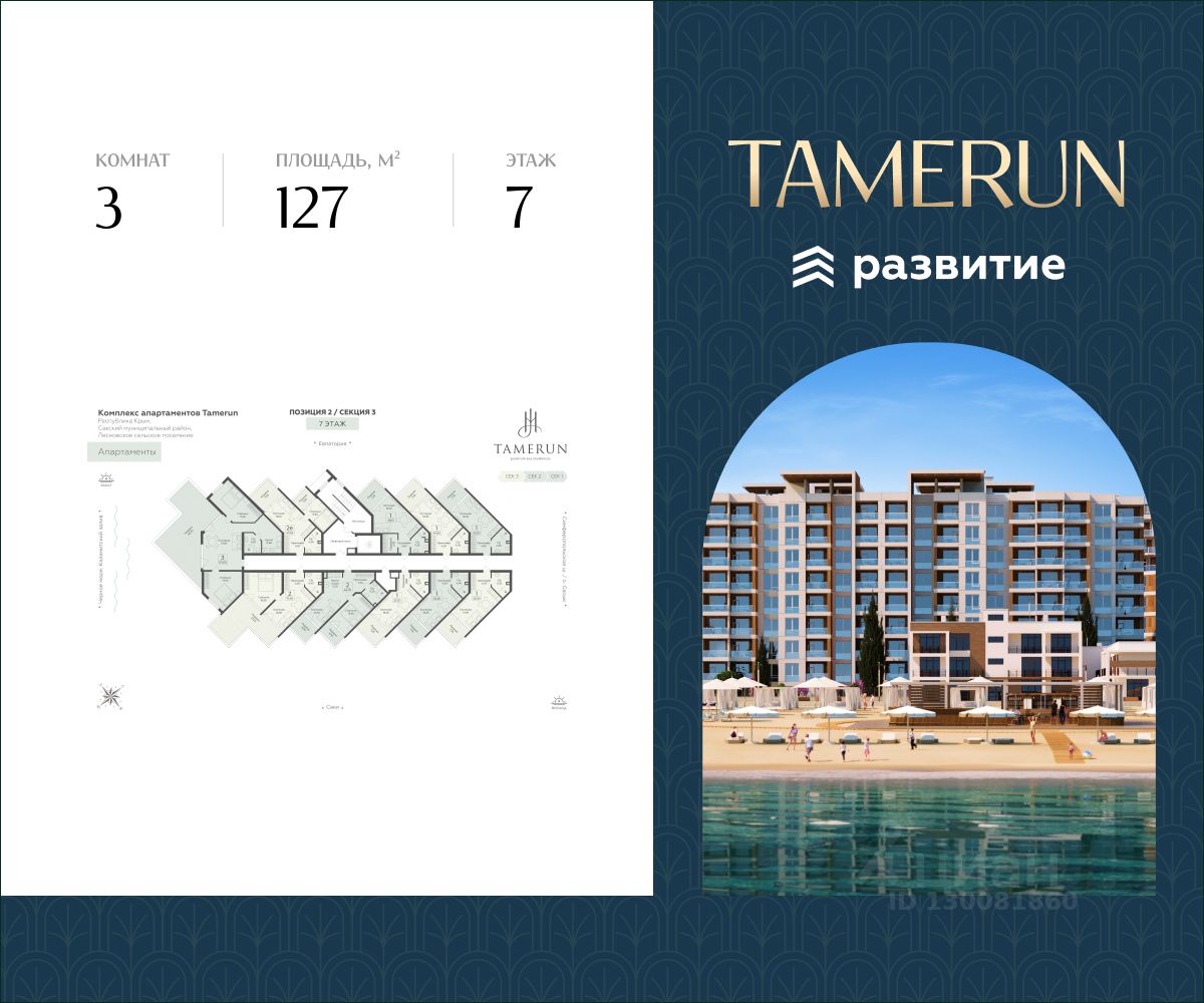 На первой береговой линии Черного моря продается апартамент площадью 127.00 кв. м без отделки. Апартамент находится в апарт-комплексе премиум-класса Tamerun Grand Mirmax 5*, между городами Евпатория и Саки от федерального застройщика ГК "Развитие".