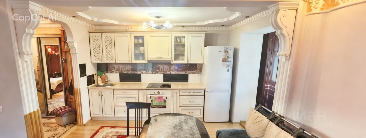 Мебель и техника хорошего качества, остается по согласованию с хозяевами. Кухня совмещена с гостиной большой аркой, что позволяет организовать застолье на большую компанию. Прекрасно подойдет для проживания семьи до четырех человек.