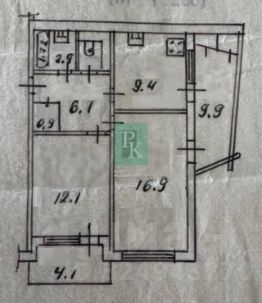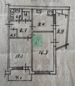 Общая площадь квартиры с учетом балкона и лоджии - 63,5 м2. Светлые комнаты 16,9 м2 с выходом на лоджию 9,9 м2 и комната 12,1 м2 с выходом на балкон 4,1 м2, просторная квадратная кухня - 9,4 м2 с выходом на лоджию 9,9 м2, коридор - 7 м2, санузел раздельный 2,9 м2 и 1,2 м2, высота потолков 2,6 м.