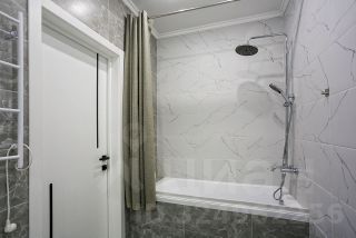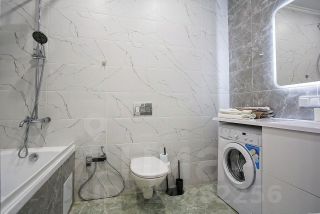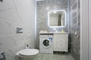 Функциональный санузел с ванной, стиральной машиной, полотенцесушителем и системами хранения.