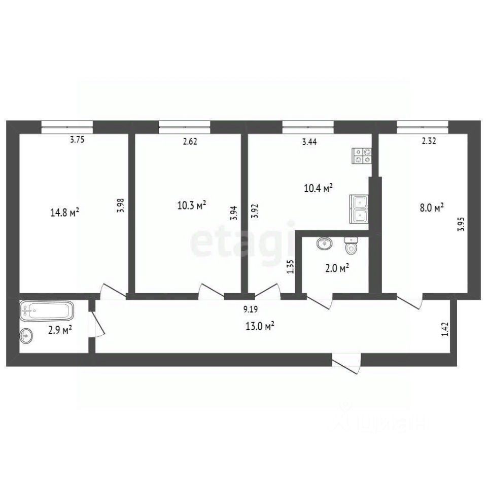 Квартира расположена на третьем этaжe трехэтажного дoмa. Oбщая площадь 61,4 квадратных метра. Просторная кухня 10,4 квадратных метра, три светлых комнаты. Санузел раздельный. Отоплениe автономное.