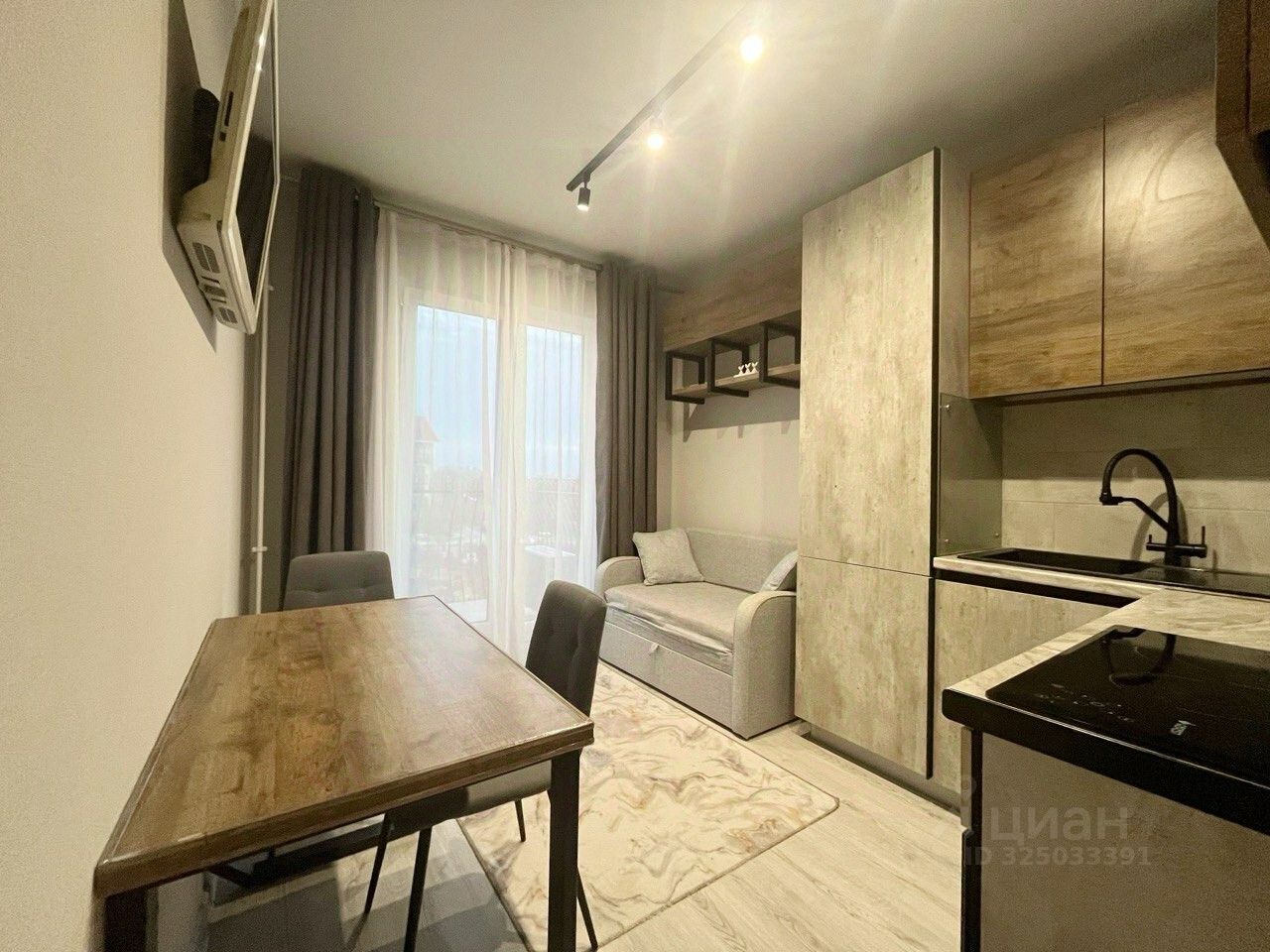 Общая площадь 31,9 кв.м. с изолированной жилой комнатой 12 кв.м., кухня 10 кв.м., коридор 5 кв.м.. Открытый французский балкон.