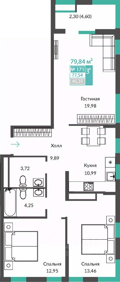 - Просторный холл площадью 10,37 м² создаст первое приятное впечатление, есть возможность разместить большой шкаф для одежды