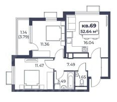 В строящемся ЖК продается 2-х комнатная квартира, которая состоит из кухни-гостиной 16,04 кв.м., двух комнат 11,36 и 11,47 кв.м., ванны 3,49 кв. м., санузла 1,65 кв.м., прихожей 7,49 кв.м. и балкона. Общая площадь квартиры 52,64 кв.м. Расположена на 2 этаже 8-ми этажного дома.