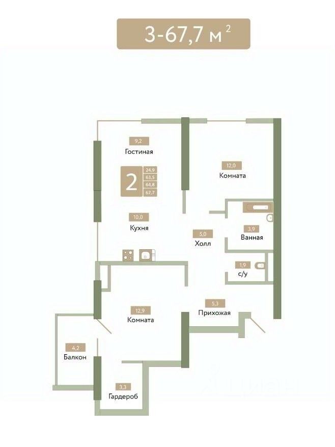 В строящемся ЖК "Солнечный парк" (пгт. Молодежное, Симферопольский район) продается отличная квартира, которая состоит из кухни-гостиной 19,2 м2, двух комнат 12,9 и 12,0 м2, раздельного санузла 3,9 и 1,9 м2, прихожей 5,3 м2, гардеробной 3,3 м2, холла 5,0 м2, балкона 1,3 м2. Общая площадь 64,8 м2.