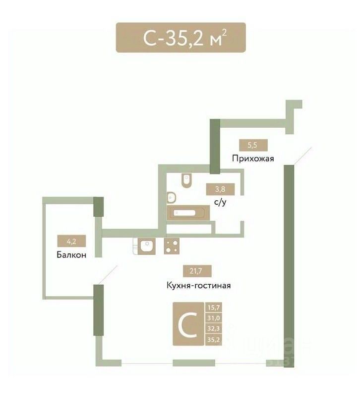 В строящемся ЖК "Солнечный парк" (пгт. Молодежное, Симферопольский район) продается отличная квартира, которая состоит из совмещенного санузла 3,8 м2, прихожей 5,5 м2, балкона 1,3 м2. Общая площадь 32,3 м2.