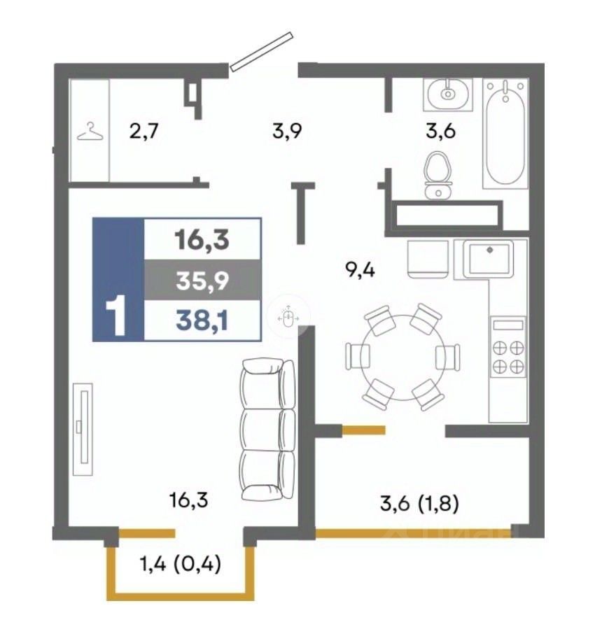 В продаже 1-но комнатная квартира, которая состоит из кухни 9,4 м2, комнаты 16,3 м2, совмещенного санузла 3,6 м2, прихожей 3,9 м2, гардеробной 2,7 м2 и 2 балконов. Общая площадь 38,1 м2.