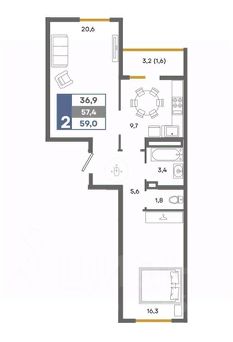 В продаже 2-х комнатная квартира, которая состоит из кухни 9,7 м2, комнат 20,6 и 16,3 м2, санузла 3,4 и 1,8 м2, прихожей 5,6 м2 и лоджии. Общая площадь 59,0 м2.