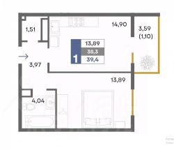 В продаже 1-но комнатная квартира, которая состоит из кухни-гостиной 14,9 м2, комнаты 13,9 м2, совмещенного санузла 4,0 м2, прихожей 4,0 м2, гардеробной 1,5 м2 и балкона. Общая площадь 39,4 м2.