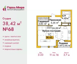 1-комн. квартира-студия с предчистовой отделкой в ЖМ "Город Мира" на 11 этаже. Общая площадь: 38.42 кв.м., площадь гостиной 24.28 кв.м., из которых 5 кв.м. выделено под кухонную зону. Все окна выходят на одну сторону. В квартире одна лоджия, один совмещенный санузел. Высота потолков 2.7 м.