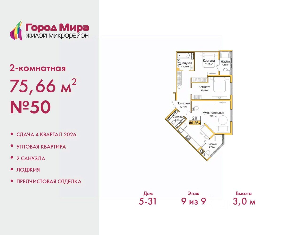 Просторная двухкомнатная квартира с предчистовой отделкой в ЖМ "Город Мира" на 9 этаже. Общая площадь: 75.66 кв.м., жилая: 24.96 кв.м., площадь просторной кухни-столовой: 28.91 кв.м. Квартира угловая, очень светлая, естественная вентиляция при открытии окон. В квартире две лоджии, один совмещенный и один раздельный санузел. Высота потолков 3,0 м.
