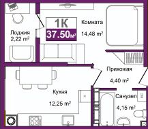 1-комн. квартира с предчистовой отделкой в ЖМ "Город Мира" на 5 этаже. Общая площадь: 37.5 кв.м., жилая: 14.48 кв.м., площадь просторной кухни-столовой: 12.25 кв.м. Все окна выходят на одну сторону. В квартире одна лоджия, один совмещенный санузел. Высота потолков 2.8 м.