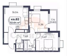 В строящемся ЖК продается 2-х комнатная квартира, которая состоит из кухни-гостиной 16,04 кв.м., двух комнат 11,36 и 11,47 кв.м., ванны 3,49 кв. м., санузла 1,65 кв.м., прихожей 7,49 кв.м. и балкона. Общая площадь квартиры 52,64 кв.м. Расположена на 4 этаже 8-ми этажного дома.