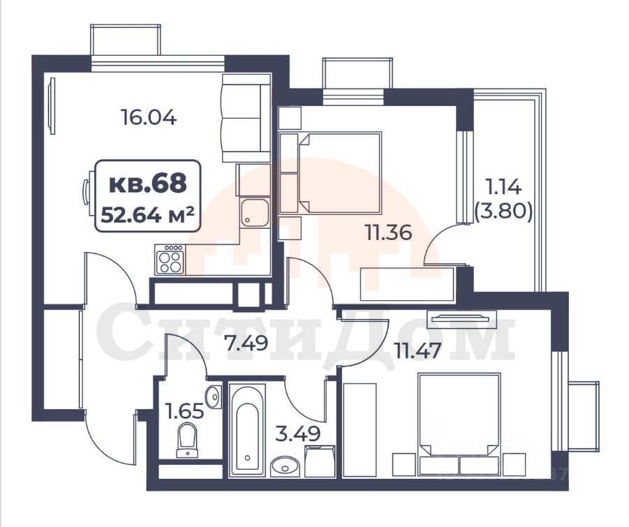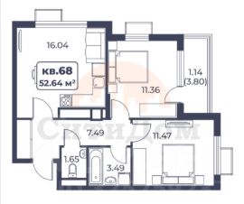 В строящемся ЖК продается 2-х комнатная квартира, которая состоит из кухни-гостиной 16,04 кв.м., двух комнат 11,36 и 11,47 кв.м., ванны 3,49 кв. м., санузла 1,65 кв.м., прихожей 7,49 кв.м. и балкона. Общая площадь квартиры 52,64 кв.м. Расположена на 2 этаже 8-ми этажного дома.